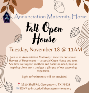 Join us for our Fall Open House on Tuesday, November 18th from 11am – 1pm (come and go). See how we support mothers and babies in need, hear an inspiring client story, and get a glimpse of our upcoming expansion.